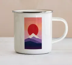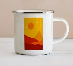 An abstract desert landscape of a sand on the foreground and mountain in red and yellow on the background. Minimalistic Japan feeling