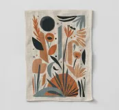 A modern abstract composition of various stylized botanical shapes and leaves in a palette of terracotta, beige, and dark blue against a light background.
