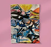 This vibrant and energetic abstract expressionist painting features a dynamic interplay of forms, colors, and textures, creating a sense of controlled chaos. Bold brushstrokes in blue, black, white, and orange dominate the canvas, with hints of yellow and green in the background. Recognizable elements, such as what appears to be a butterfly and fragmented facial features, emerge from the abstract composition, inviting multiple interpretations. This high-quality digital poster (7000x5000 pixels, 300 dpi) perfectly captures the raw emotion and spontaneous energy of abstract expressionism, making