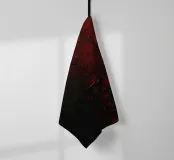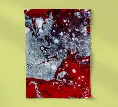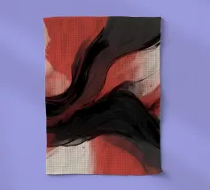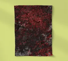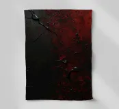 Bold black and red paint splashes cover a dark surface, creating an abstract design. The contrasting colors emphasize texture and depth, enhancing artistic expression.