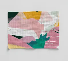 A modern, abstract composition featuring a patchwork of various patterns and shapes. Elements include organic leaf like forms, geometric grids, and abstract textures in a muted palette of pink, black, and beige, reflecting a bohemian, eclectic style.