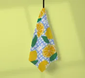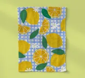 lemon design, citrus pattern, summer kitchen decor, fruit illustration, blue checkered art, fresh vibrant print