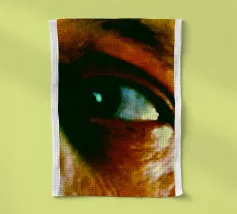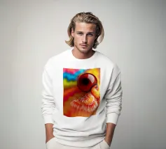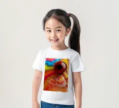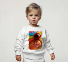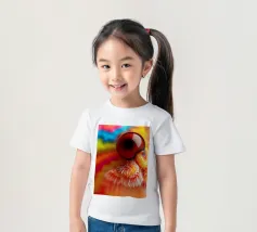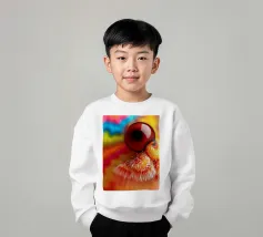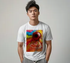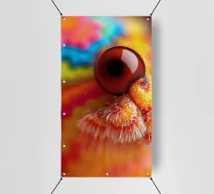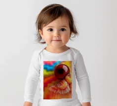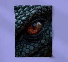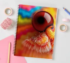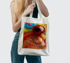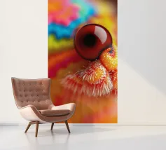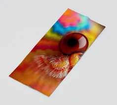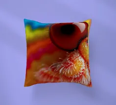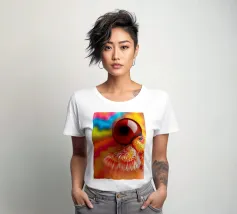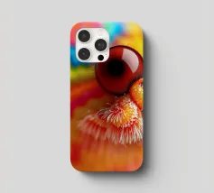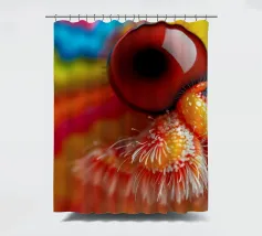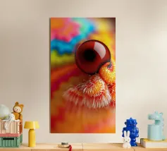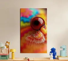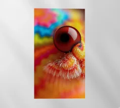 A striking close-up reveals a vibrant creature adorned with colorful patterns and intricate details. The design features a prominent eye and delicate textures