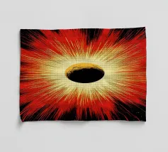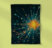 A vibrant display illustrating the aftermath of a particle collision, featuring bright colors and energetic trails emanating from a central point, resembling a scientific visualization.