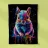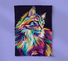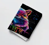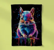 A colourful squirrel looks directly into the camera with large, expressive eyes. The illustration uses a wide range of bright colours - including blue, pink, purple, red and yellow - which make the fur appear vibrant. The colour gradient is particularly striking, running from the ears to the paws and ending in bold splashes and drops of colour. The background is deep black, which emphasises the brilliant colours even more and gives the motif a modern, dynamic look.