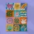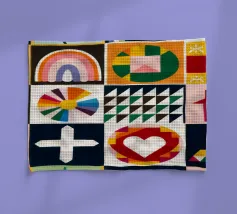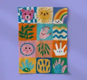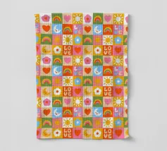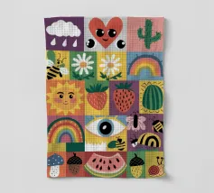 A colorful patchwork quilt design featuring cute characters like a sun, a rainbow, a lion, a bunny, and abstract hands on checkered backgrounds.
