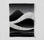 Curved black and white waves undulate across the canvas, forming an abstract landscape. The smooth transitions create a sense of rhythm and depth, inviting contemplation and creativity.
