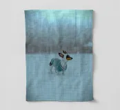 The little dog with pure white fur was walking on the soft snow. On its head, it wore a warm white scarf, rolled up around its ears and forehead, and a blue shirt, looking both cute and warm. Tiny footprints were imprinted on the thin layer of snow, leaving small, pretty trails behind it. Its eyes were sparkling, its tiny black nose was shaking in the cold wind, creating a funny and heartwarming image in the middle of the winter scene.