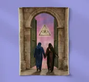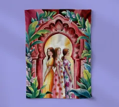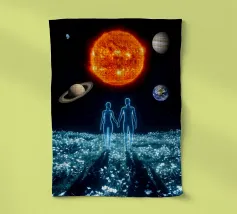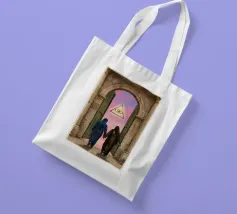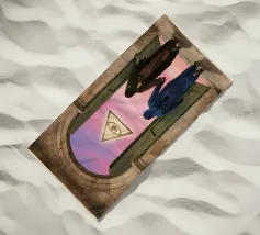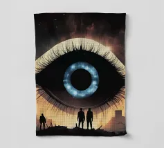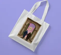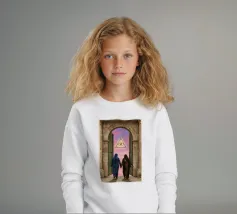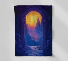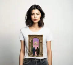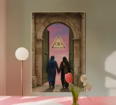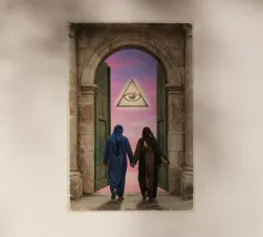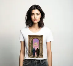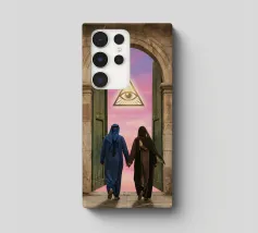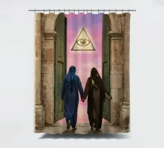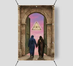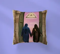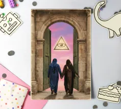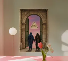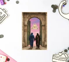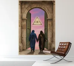 This surreal artwork portrays two robed figures walking hand-in-hand through an ancient stone archway toward a glowing sky of pink and violet hues. Above them floats a radiant geometric eye, symbolizing awareness, mystery, and deeper understanding. The blend of historic architecture, soft sunset colors, and symbolic iconography creates a scene filled with meaning and imagination. Ideal for fans of spiritual art, surreal storytelling, and thought-provoking wall décor that inspires curiosity and reflection.