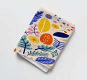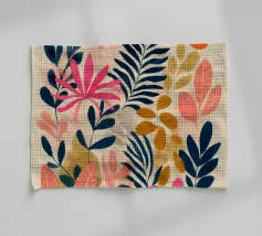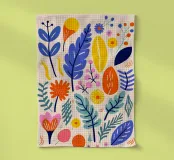 Bright, colorful leaves and flowers are scattered across a light background, creating a lively botanical pattern. The design features bold blues, yellows, reds, and greens, evoking a sense of playful nature.