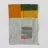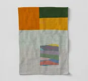 Bold blocks of color dominate the composition with an emphasis on orange and green in the upper part and a more muted pale background. A smaller rectangle with a multicolored and layered design is centered against the pale backdrop, creating a striking contrast.