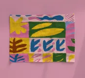 A playful and energetic pattern of geometric and organic shapes arranged in a colorful patchwork or quilt like design. The artwork is a joyful and vibrant celebration of color and form.