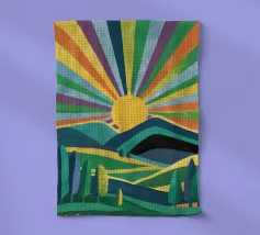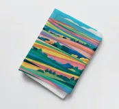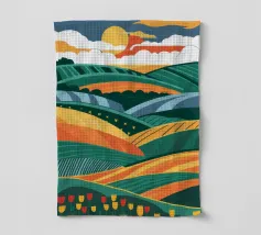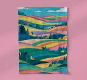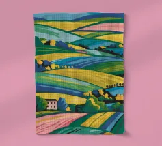 A beautiful landscape of rolling hills and fields, rendered in a colorful patchwork of greens, blues, pinks, and yellows, evoking a sense of idyllic countryside.