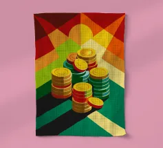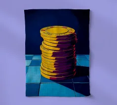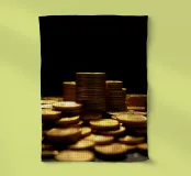 Piles of shiny coins are arranged in varying heights, surrounded by scattered coins, all illuminated against a black background, creating an eye-catching contrast.