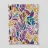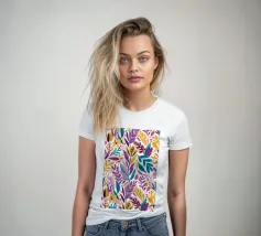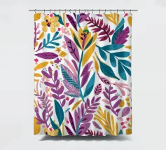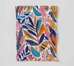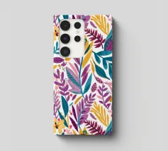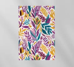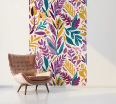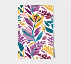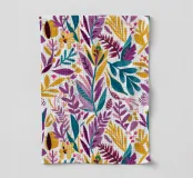 A dense, seamless pattern of stylized leaves and botanicals in a vibrant palette of purple, pink, and teal on a white background. The design is intricate and full of life.