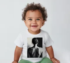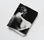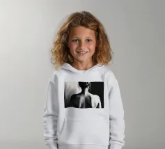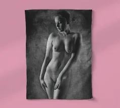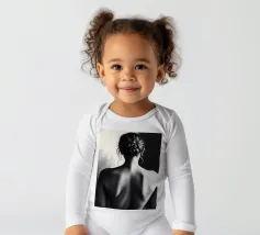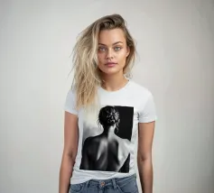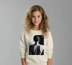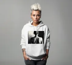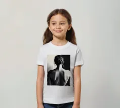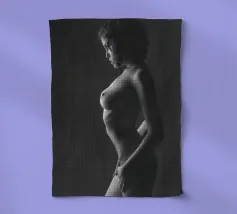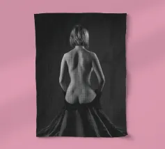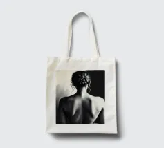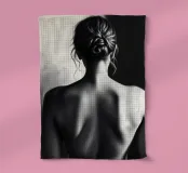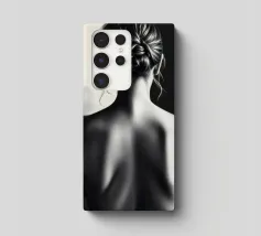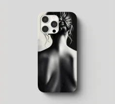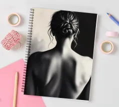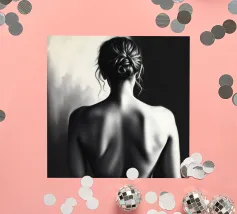 A woman poses with her back turned, showcasing the contours of her spine and shoulder blades. The black and white tones enhance the beauty of her silhouette and create an artistic atmosphere.