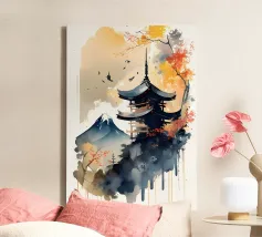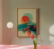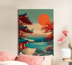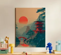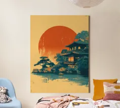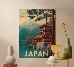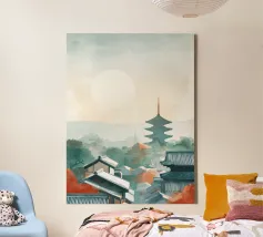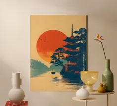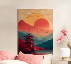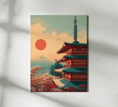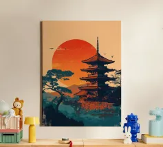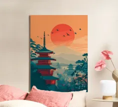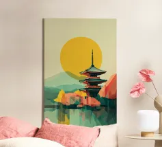 Step into the serene beauty of Japan with this minimalist travel poster inspired by Kyoto's iconic pagoda temples. Featuring bold geometric shapes, overlapping sun and moon circles, and rich teal-red tones, this artwork blends modern design with traditional calm. Perfect as a wall print for lovers of Japanese culture, zen décor, and graphic travel art. A striking statement piece for any space.