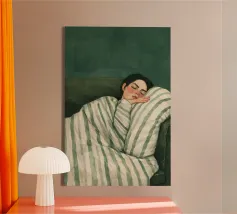This contemporary portrait captures a moment of quiet introspection through soft painterly textures and a restrained color palette. The feminine figure, rendered in gentle brushstrokes and subtle contrasts, emerges from layered green tones that evoke calm and emotional depth. Vertical marks and delicate highlights add rhythm and atmosphere, while the relaxed pose suggests vulnerability and self-awareness. Balancing figurative clarity with expressive abstraction, this artwork is ideal for modern interiors, editorial illustration, or fine art prints that celebrate stillness, femininity, and refl