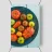 Colourful selection of tomato varieties in different shapes and colours, arranged on a dark blue plate. The freshness and variety of tomatoes in a bright, summery scene with a mint green wooden background.