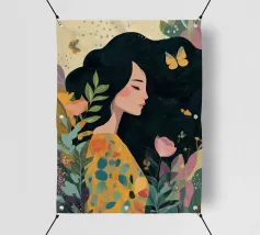 A portrait of a woman with flowing red hair, surrounded by stylized leaves and flowers, looking thoughtfully to the side. The style is modern, bold, and slightly art nouveau.