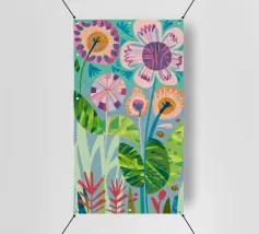 A vibrant and intricate abstract composition resembling a patchwork quilt, with distinct panels filled with stylized leaves, floral elements, and abstract patterns in a rich array of colors. The organized yet playful arrangement creates a sense of handcrafted artistry.