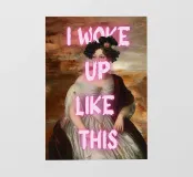 Embrace effortless style with "I Woke Up Like This," a fun pop art print that humorously blends classical portraiture with a popular modern phrase. This captivating artwork features a regal historical figure, adorned with an elegant coiffure, her gaze subtly directed away, as if caught in a candid moment. The bold, glowing pink text "I WOKE UP UP LIKE THIS" overlays the image, making a relatable and witty statement about natural beauty (or lack thereof!). It's a perfect blend of timeless charm and contemporary humor, ideal for adding personality and a lighthearted touch to any modern interior.