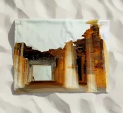 A hauntingly beautiful digital reconstruction of ancient architecture dissolving into light and abstraction. Soft amber and ivory tones merge with geometric precision, giving the impression of classical ruins caught between presence and memory. The faint silhouette of a lone figure enhances the scale and emotional depth, evoking themes of history, decay, and transcendence.