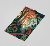 A vibrant and stylized illustration depicting a whimsical forest scene. A winding reddish path leads the viewer through a dense array of colorful trees and lush, oversized foliage. The color palette is rich and varied, with deep greens, reds, oranges, and hints of lighter blues and yellows, creating a fantastical and inviting atmosphere. The art style is bold and graphic, emphasizing shapes and textures over realistic detail.