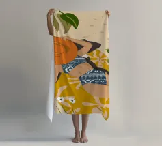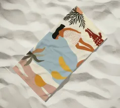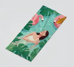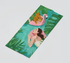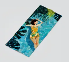Sunlight filters through tropical leaves as she floats peacefully in a pool, completely at ease. The world around her fades into soft color and quiet shapes—beach balls, sandals, and time itself all left behind. A visual exhale, this piece is a reminder to pause, breathe, and let rest be enough.