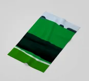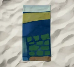 A series of layered greens and dark tones suggest a minimalist landscape. The composition evokes a sense of tranquility with horizontal bands that mimic fields and distant hills.