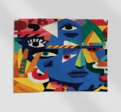 A series of fragmented and overlapping faces rendered in bold, contrasting colors. Geometric shapes and patterns add to the sense of disarray and complexity.