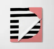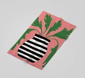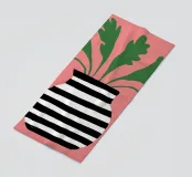 A large green leaf plant sits in a bold blackandwhite striped pot, creating a simple yet striking graphic statement against a solid light pink background.
