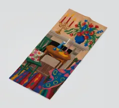 A wooden dining table stretches into a warmly lit interior filled with pottery and vibrant shadows, celebrating home�s quiet rhythm.