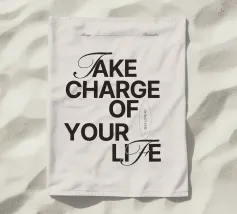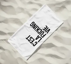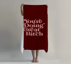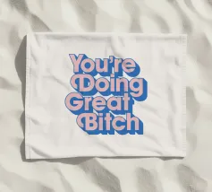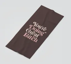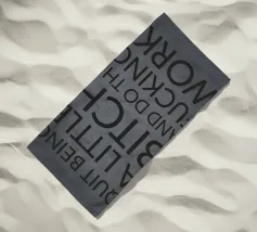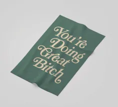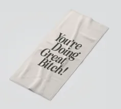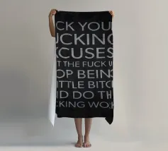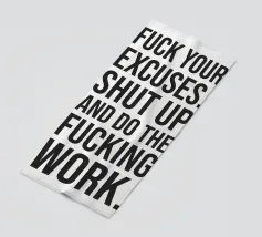 "The words YOU'RE F*CKING LAZY BITCH' are stacked in a bold, black sans-serif font, with the asterisk censoring the 'U' in 'FUCKING, followed by the phrase 'PUT DOWN PHONE AND GET UP' in a smaller, more delicate serif font, all set against a textured off-white background.",