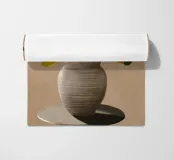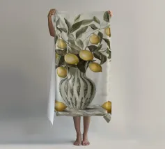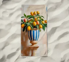 A fresh, vibrant still life featuring a ceramic vase filled with leafy lemon branches. With its warm tones and minimalist background, this artwork brings Mediterranean charm and natural beauty into any kitchen or living space.