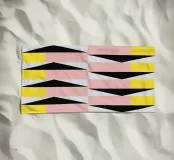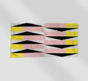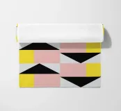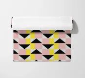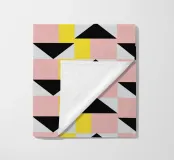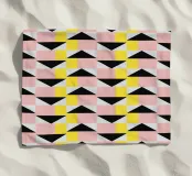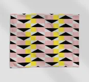 Geometric patterns repeat in a symmetrical design, featuring triangles and rectangles in black, yellow, and pink. The structured arrangement creates a visually striking and orderly composition.