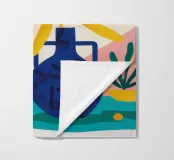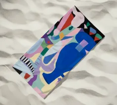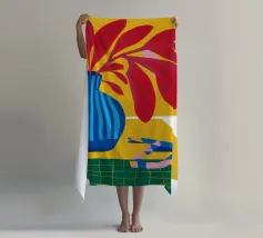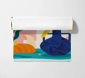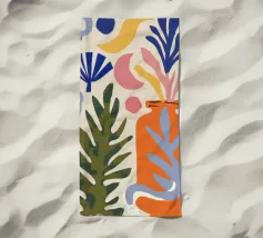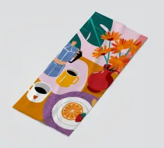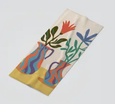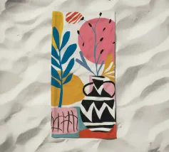 A modern, abstract still life featuring a stylized plant in a blue vase, a croissant, and organic shapes under a yellow sun, all in a balanced, warm composition.