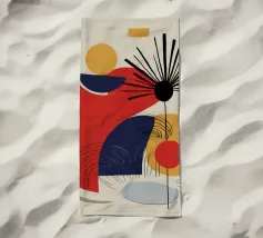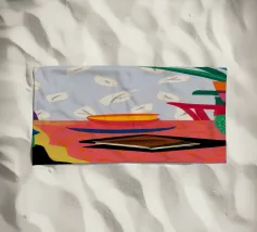 An abstract composition features a bowl of strawberries amidst a swirl of colorful, organic shapes and patterns, creating a fresh and modern interpretation of a summer classic.
