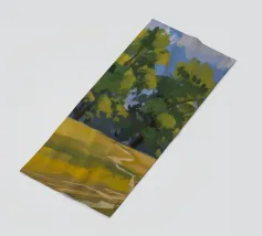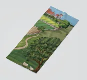 A rolling landscape of green and golden patchwork fields is seen from a high vantage point, with a lone tree and a distant farmhouse, celebrating the beauty of agriculture.