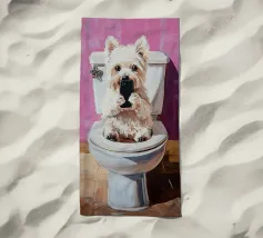 A humorous illustration for the guest toilet: "Sit down, don't pee standing up!" - in trendy colours and minimalist design, perfect for a modern bathroom.