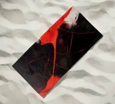 A dynamic abstract digital painting featuring sharp-edged geometric shapes in vivid red, orange, and yellow hues set against a deep burgundy and black backdrop. The design evokes warmth, energy, and contrast through intense color and angular fragmentation.