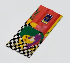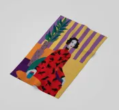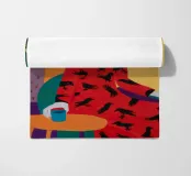 A woman in a red bird print robe sits in a patterned room holding coffee with a quiet yet graphic presence.