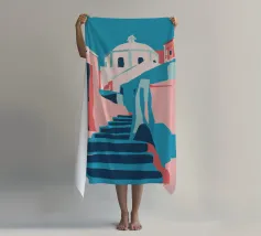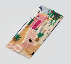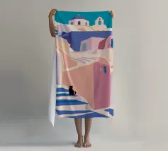 A black cat pauses on the iconic whitewashed steps of Santorini, with the famous red domed church and blue sea in the background, capturing a peaceful moment of Greek island life.
