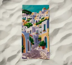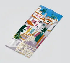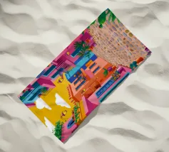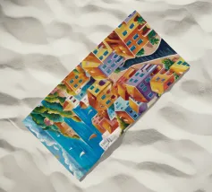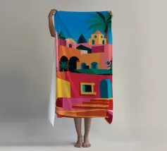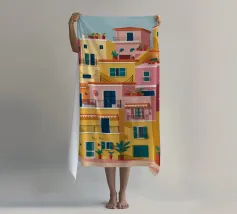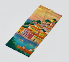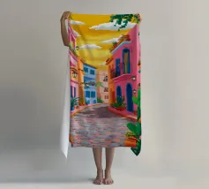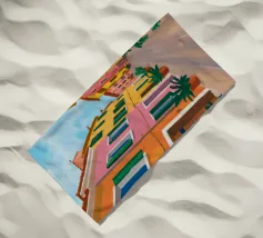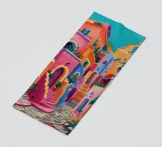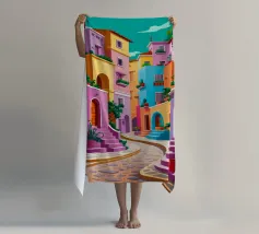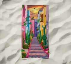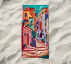 A vibrant street scene with colorful buildings and a bright pink stairway leading upwards, evoking a lively Mediterranean or Italian coastal town.