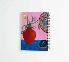 A bold red vase, filled with various flowers, sits on a blue patterned surface, with a dynamic pink and patterned background creating a richly textured and colorful composition.