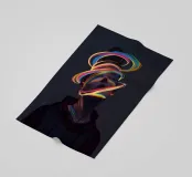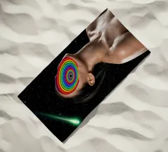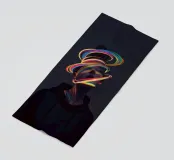 A surreal digital artwork features a woman in a dark hoodie, her face illuminated by vibrant neon light trails. The glowing, multicolored swirls wrap around her head and neck, creating a futuristic and dreamlike atmosphere.