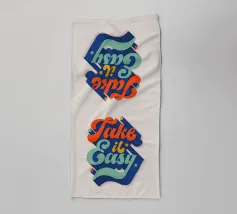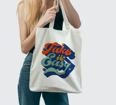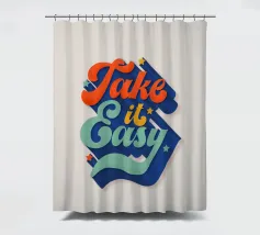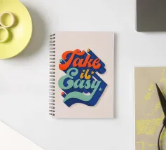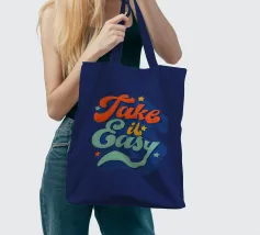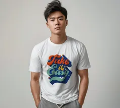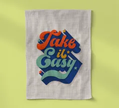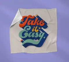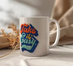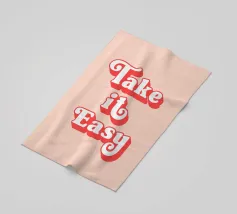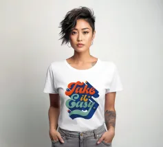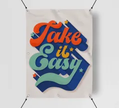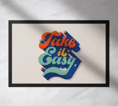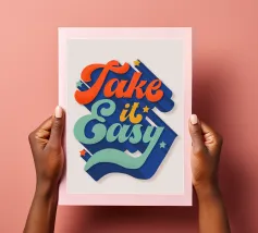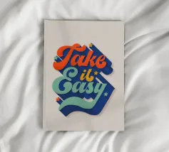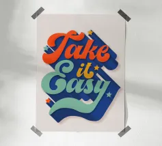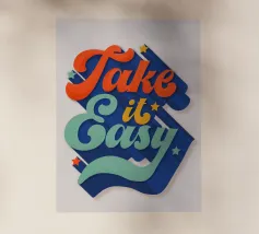 A vibrant retro-style typography design featuring the phrase "Take It Easy" in bold, 70s-inspired lettering. The warm mix of red, blue, and mint green with star accents adds a playful and nostalgic feel, perfect for a relaxed and stylish aesthetic. A stylish, nostalgic piece that radiates calm and joy. Designed by showmemars