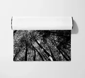 Black and white view from below of a forest of very tall trees.
