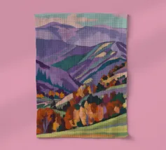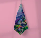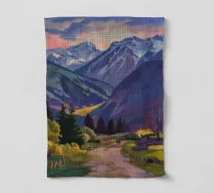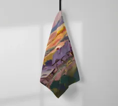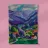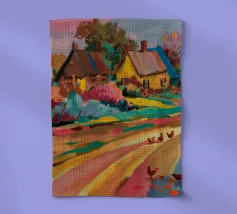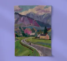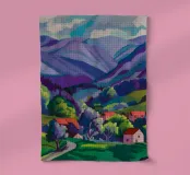 A colorful landscape painting depicts a village nestled on a hillside with vibrant, patchwork-like fields in shades of green, blue, and purple, with red-roofed houses under a clear sky.