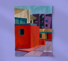 The stark geometry of a covered walkway is defined by bold crimson pillars and the long, sharp shadows they cast in the bright sunlight. This painting is a powerful study of light, shadow, color, and architectural form.
